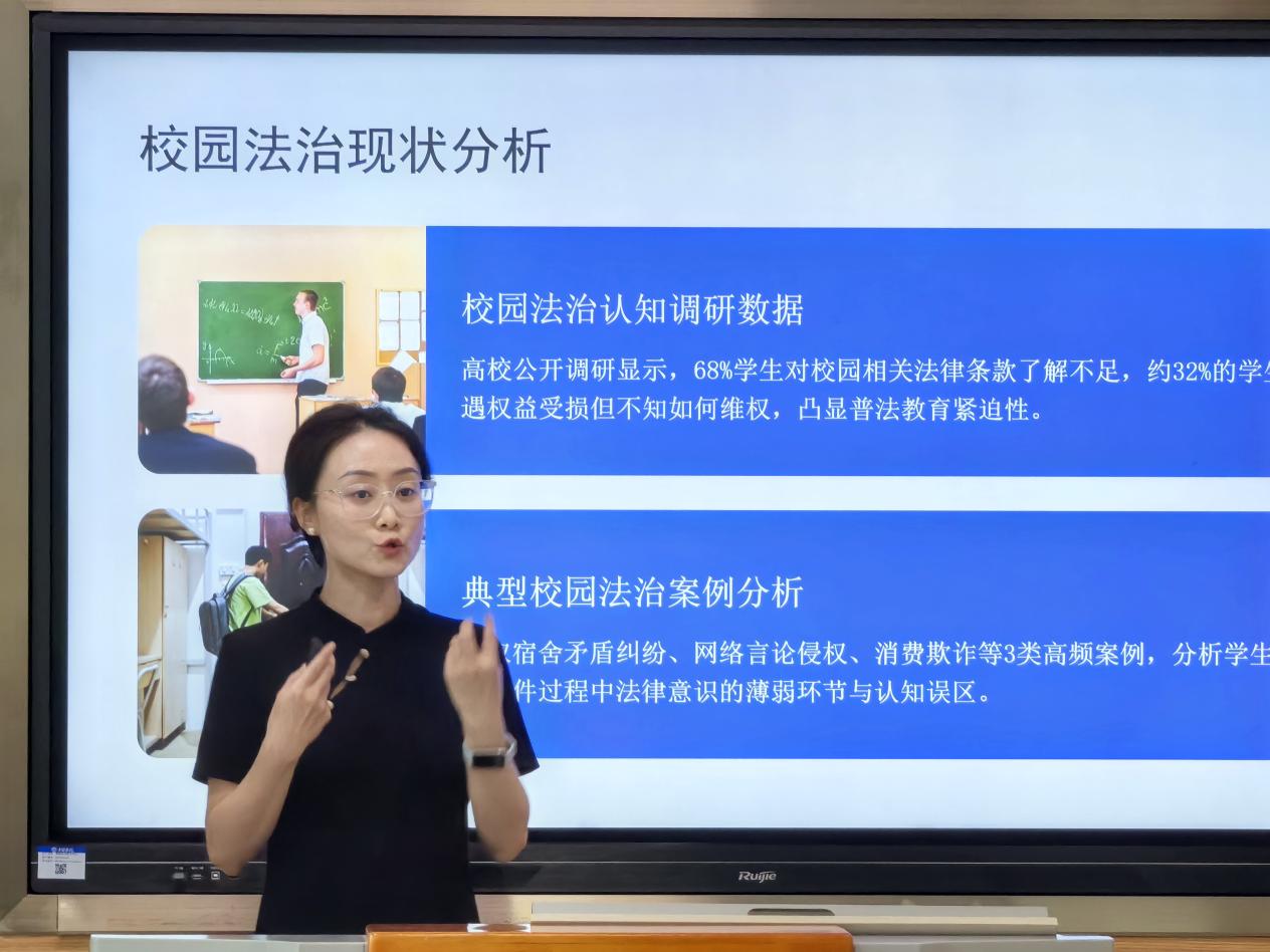 2025年10月14日周二下午,第三轮也是最后一轮院级项目式教学比赛如期举行。三位晋级教师围绕各自精心设计的项目式教学课题,展开了最后的精彩展示。孙娟老师以“‘智慧蓉城’的温度:从科学发展观透视数字公平”为题,通过生动的案例和深入的分析,展现了科学发展观在数字时代的独特价值;杨函老师则以“校园法治微守护:我的普法行动提案”为题,结合校园实际,提出了具有创新性和实践性的普法方案;王柯老师则以“全面深化改革是一场深刻革命—从外卖到美好生活的深水区突围”为题,深入剖析了全面深化改革的重要性和紧迫性。经评审团综合评定,杨函老师凭借课题的创新性、实践性与教学展示的感染力,最终夺得冠军,并获得代表学院参加校赛的资格。